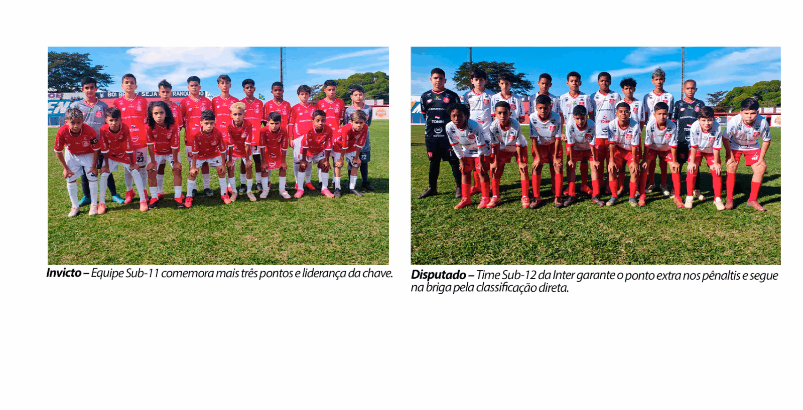 As categorias Sub-11 e Sub-12 da Inter de Bebedouro entraram em campo no domingo (3) e fizeram bonito diante do Tanabi, pela 8ª rodada do Campeonato Paulista. Enquanto o Sub-11 venceu por 2 a 0 e confirmou a liderança no grupo, o Sub-12 empatou sem gols, mas garantiu o ponto extra nas penalidades, resultado que recoloca a equipe na zona de classificação direta para a próxima fase.