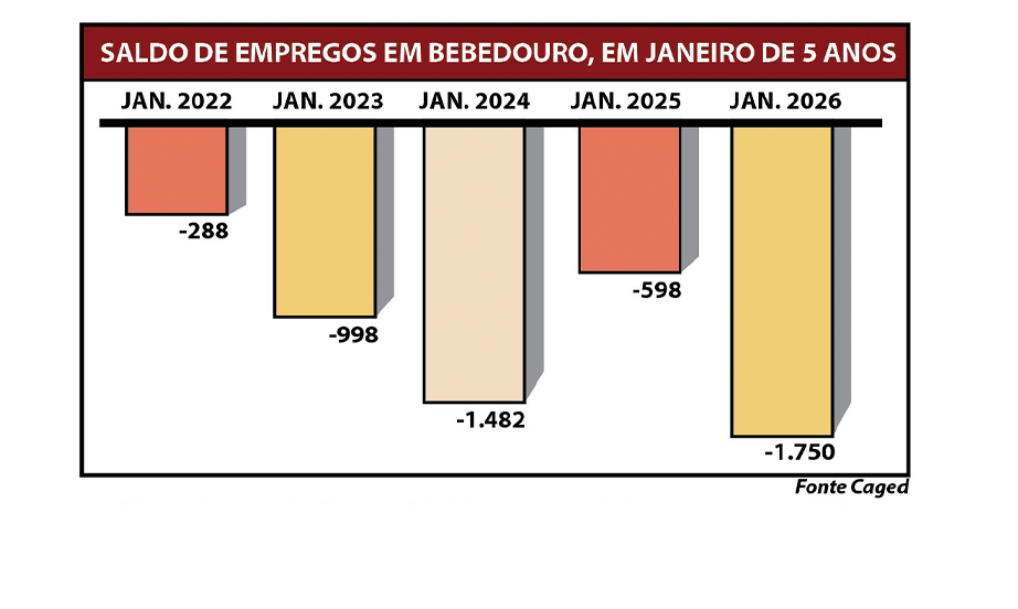 Bebedouro iniciou 2026 com saldo negativo de 1.750 empregos formais, segundo dados do Caged (Cadastro Geral de Empregados e Desempregados) divulgados pelo Ministério do Trabalho. Em janeiro, o município registrou 959 admissões e 2.709 desligamentos, resultando na redução do estoque de trabalhadores com carteira assinada.