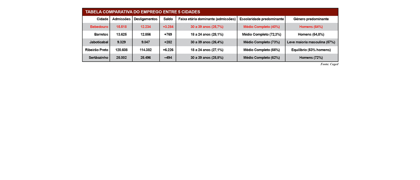 A Gazeta analisou o comportamento do mercado de trabalho formal entre janeiro e setembro de 2025 em cinco municípios da região: Bebedouro, Barretos, Jaboticabal, Ribeirão Preto e Sertãozinho. O levantamento tem como base os dados oficiais do Caged e revela que, embora os cenários apresentem pontos de convergência, como a forte predominância do Ensino Médio Completo, a centralidade das faixas etárias entre 18 e 39 anos e a baixa participação de trabalhadores com mais de 50 anos, também há diferenças importantes entre os municípios.