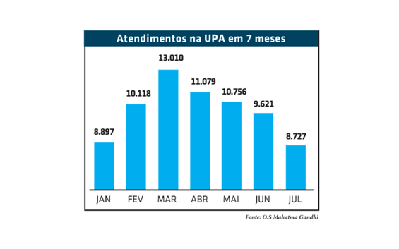 Em julho, a UPA de Bebedouro atendeu 8.727 pacientes, queda de 9,29% em relação a junho, que contabilizou 9.621 consultas aos bebedourenses. No acumulado do ano, a UPA já realizou 72.208 atendimentos. Os dados foram fornecidos pela O.S Mahatma Gandhi, responsável pela UPA 24h, a pedido da Gazeta.