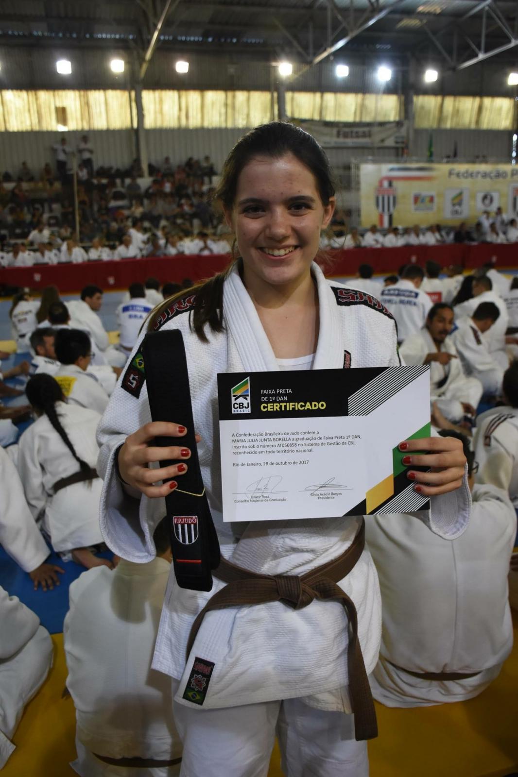 A judoca bebedourense Maria Júlia Borella conquistou um dos maiores objetivos de sua trajetória esportiva: a faixa preta (também chamada shodan). A prova da atleta aconteceu em 29 de outubro (um sábado), no Clube Juventus, em Ribeirão Preto, e em entrevista a Gazeta, ela falado dia marcante e dos planos para o futuro, que continuam incluindo o esporte.