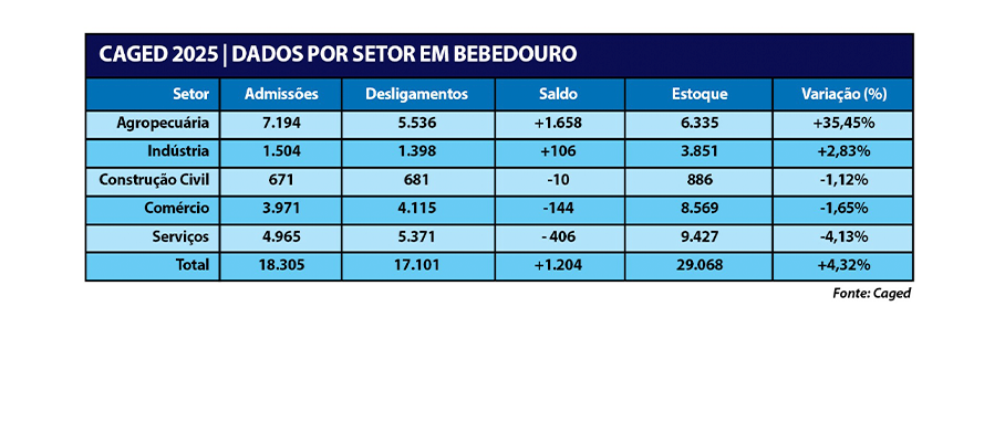 Em 2025, para cada 100 trabalhadores contratados em Bebedouro, cerca de 93 foram demitidos ao longo do ano. No total, o município registrou 18.305 admissões e 17.101 desligamentos, o que significa que, em números absolutos, 1.204 trabalhadores a mais permaneceram empregados ao final do período. Em outra leitura, a cada 10 pessoas que conseguiram um emprego formal em 2025, aproximadamente 9,3 perderam o posto, resultando em crescimento líquido do emprego formal no município. Os dados são do Caged (Cadastro Geral de Empregados e Desempregados), divulgados pelo Ministério da Economia na tarde de quinta-feira (29).