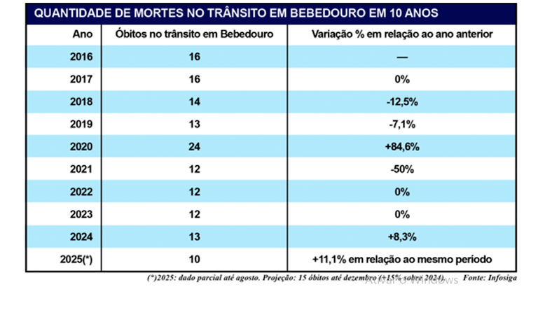 Entre janeiro e agosto de 2025, 10 pessoas morreram em acidentes de trânsito em Bebedouro, segundo levantamento do Infosiga. O número é superior ao registrado no mesmo período de 2024, quando foram contabilizados nove óbitos em vias e rodovias que circundam o município. Os dados mostram que Bebedouro encerrou 2024 com 13 mortes no trânsito. Isso significa que, em apenas oito meses, os casos de 2025 já correspondem a 77% do total de todo o ano anterior, revelando que, mesmo com variação pequena em relação ao período acumulado de 2024, a tendência é de alta.