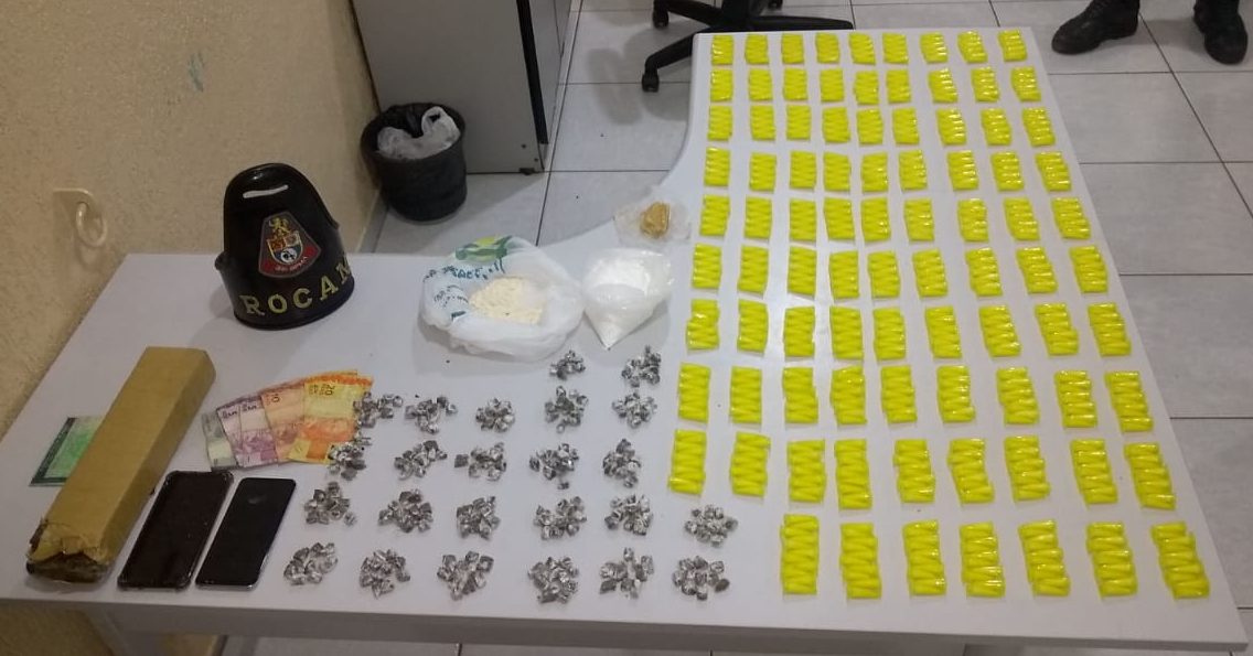 Em patrulhamento de Rocam, pelo Jardim São Carlos, na terça-feira (8), a Polícia Militar viu motocicleta modelo Honda Biz, com duas mulheres, sendo que a passageira carregava uma mochila vermelha nas costas. Ao avistarem a equipe da PM, as duas demonstraram nervosismo, fugindo em alta velocidade, sendo seguidas pelos policiais, que as abordaram na rua Augustinho de Brito. Na mochila que estava com uma das suspeitas, foram encontrados 841 pinos contendo cocaína. Um tijolo e 47 porções de maconha embaladas em plástico incolor, e 278 g de cocaína a granel também estavam escondidos na mochila.
