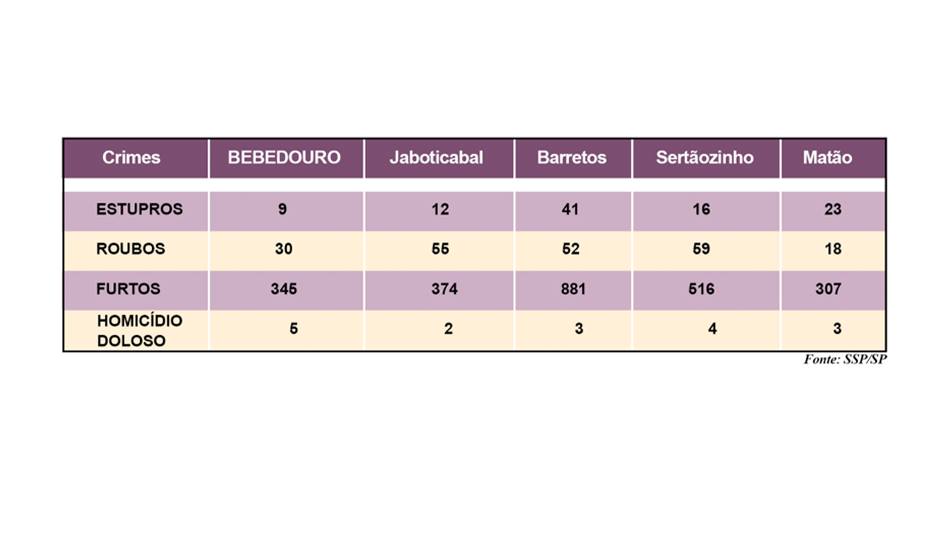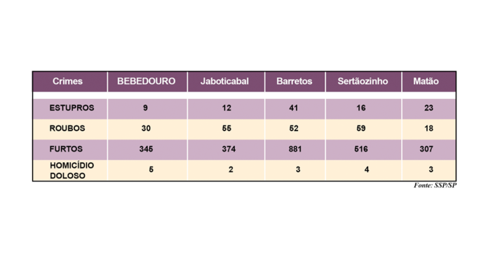 A Gazeta analisou os dados das estatísticas criminais de Bebedouro, Jaboticabal, Sertãozinho, Barretos e Matão, as cidades que a redação acompanha, de acordo com dados da SSP/SP (Secretaria de Segurança Pública do Estado de São Paulo). Juntos, os cinco municípios têm 4.258 crimes registrados entre janeiro e julho deste ano. Do total, 37,62% estão concentrados em Barretos, que soma 1.602 delitos, sendo a cidade mais violenta da região de Bebedouro. Por lá, a polícia registra média de 7,6 crimes/dia neste período.