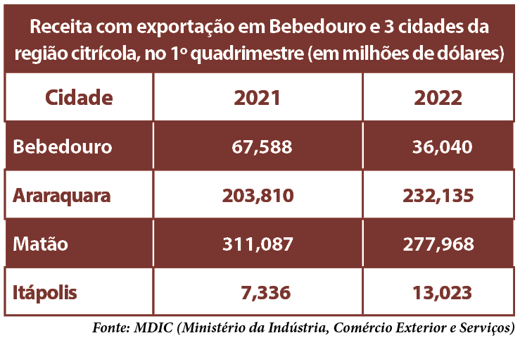 A Gazeta analisou o desempenho na exportação de Bebedouro e de mais três cidades citrícolas: Araraquara, Matão e Itápolis, no período entre janeiro e abril, comparando-os ao mesmo período de 2021, com base nos dados do MDIC (Ministério da Indústria, Comércio Exterior e Serviços).