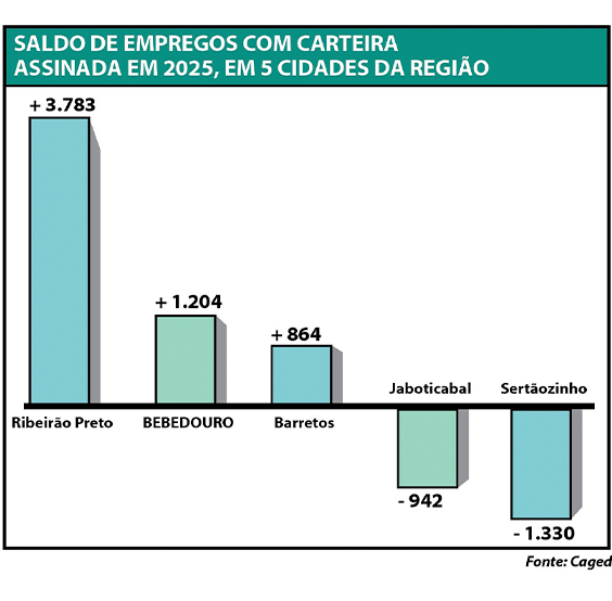 Os dados do Caged (Cadastro Geral de Empregados e Desempregados), divulgados pelo Ministério do Trabalho e Emprego, mostram comportamentos do mercado de trabalho formal em 2025 nas principais cidades da região. A Gazeta realizou levantamento comparativo entre Bebedouro, Barretos, Jaboticabal, Ribeirão Preto e Sertãozinho, analisando admissões, desligamentos, saldo de empregos e o desempenho setorial ao longo do ano passado.