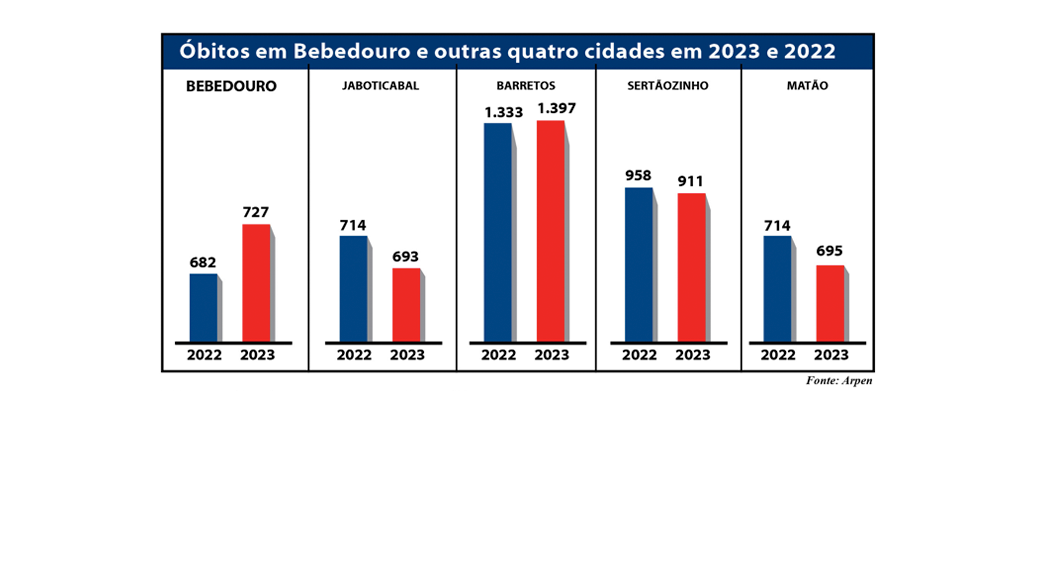 A Gazeta analisou os dados do Portal da Transparência do Registro Civil da Arpen, referentes aos nascimentos e óbitos de Bebedouro e outras quatro cidades da região: Jaboticabal, Barretos, Sertãozinho e Matão. Nos números de novos registros, somente Matão teve crescimento entre 2022 e 2023 e, nos registros de óbitos, duas cidades cresceram e três apresentaram queda.
