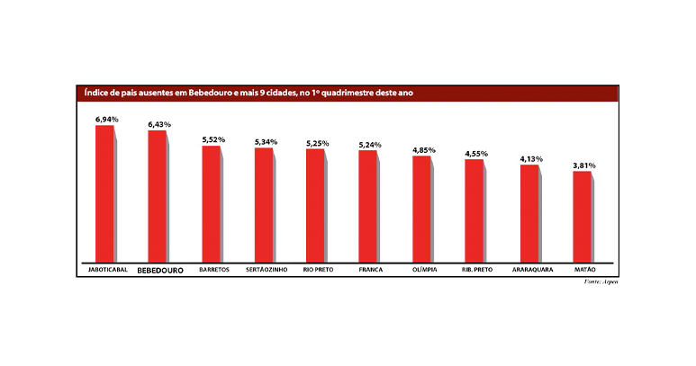 Entre janeiro e abril, os cartórios de Bebedouro registraram a certidão de nascimento de 280 crianças, com 18 delas sem constar o nome do pai. Com isto, o índice de pais ausentes na cidade, no primeiro quadrimestre, é de 6,43%. Na comparação com o mesmo período do ano passado, houve crescimento de 14%, pois nos quatro primeiros meses de 2023, Bebedouro registrou o nascimento de 266 crianças, com 15 delas sem o nome do pai na certidão, representando 5,64% de pais ausentes. Os dados são do Portal da Transparência do Registro Civil da Arpen.