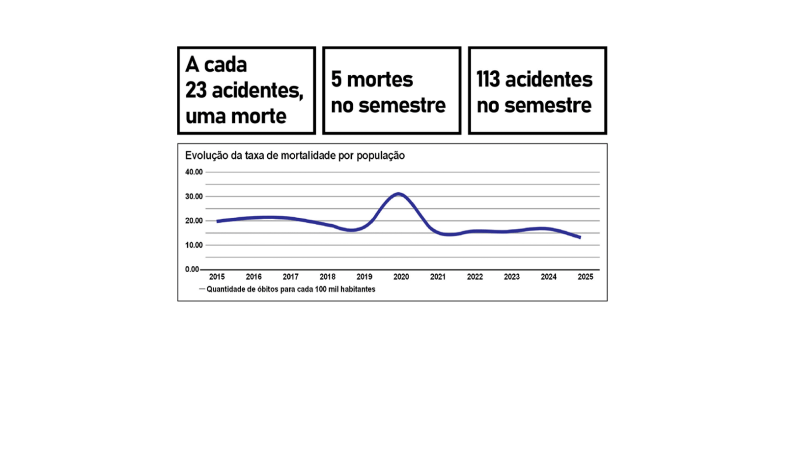 Bebedouro manteve a estabilidade no número de mortes no trânsito no primeiro semestre de 2025. De acordo com dados do sistema Infosiga-SP, foram registrados cinco óbitos em vias urbanas e rodovias que cortam a cidade entre janeiro e junho deste ano, o mesmo número observado no mesmo período de 2024. O painel também mostra o registro de 113 acidentes, com 210 vítimas, incluindo as cinco fatais, ou seja, uma pessoa morreu a cada 23 acidentes nas vias e rodovias de Bebedouro no período analisado.
