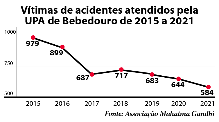 Pelo sétimo ano consecutivo, no acumulado do ano, a UPA 24h (Unidade de Pronto Atendimento) registra queda no número de acidentados em Bebedouro, segundo relatório fornecido pela Associação Mahatma Gandhi, responsável pela gestão da unidade.