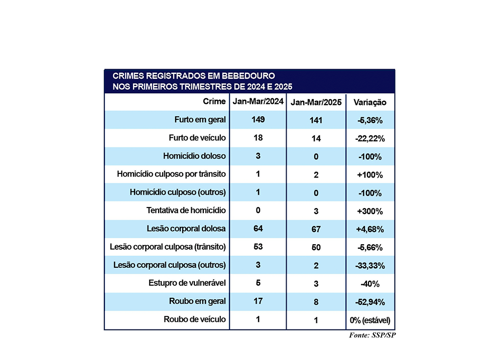 Embora os furtos em geral ainda liderem entre os crimes mais registrados em Bebedouro, o comparativo com 2024 mostra redução. Também houve queda em delitos como homicídios dolosos, roubos em geral e estupros de vulnerável. Já alguns crimes como, tentativa de homicídio e a lesão corporal dolosa, registraram crescimento. O levantamento considera os dados de janeiro, fevereiro e março, divulgados pela SSP-SP (Secretaria de Segurança Pública do Estado de São Paulo), em 30 de abril.
