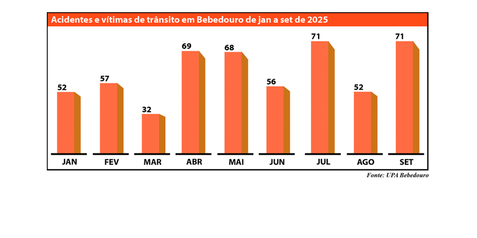 O relatório mensal da UPA (Unidade de Pronto Atendimento) de Bebedouro referente a setembro de 2025 aponta que 71 pessoas foram atendidas em decorrência de 55 acidentes de trânsito ocorridos no município durante o mês. O levantamento mostra que a queda de motocicleta continua sendo a principal causa dos atendimentos, respondendo por mais da metade dos casos registrados.