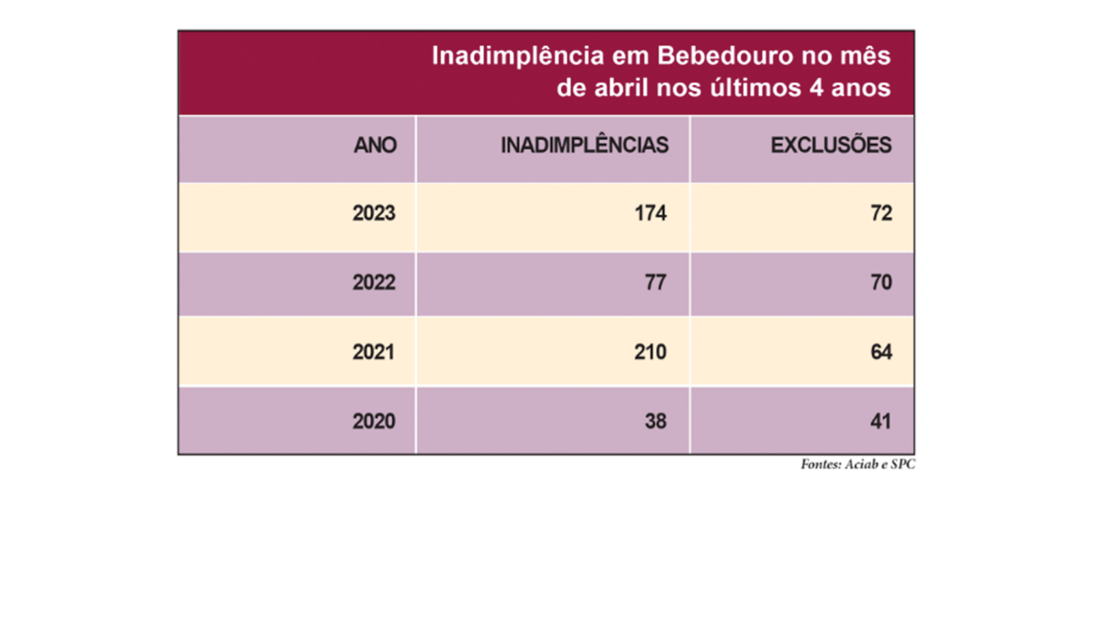 O índice de endividados em Bebedouro recuou 3% no mês de abril, com a inclusão de 174 CPFS ante 179 em março, segundo dados da Aciab (Associação Comercial, Industrial e Agrícola de Bebedouro), através de levantamento de dados inseridos no SPC (Serviço de Proteção ao Crédito).
