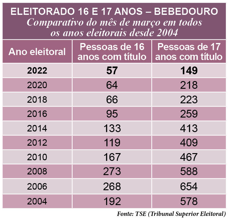 Comparativo feito pela Gazeta com os números de bebedourenses com título de eleitor até o final de março mostra que as pessoas com 16 e 17 anos aptas a votar é o mais baixo desde que o TSE (Tribunal Superior Eleitoral) começou a divulgar os dados por mês, em 2004.