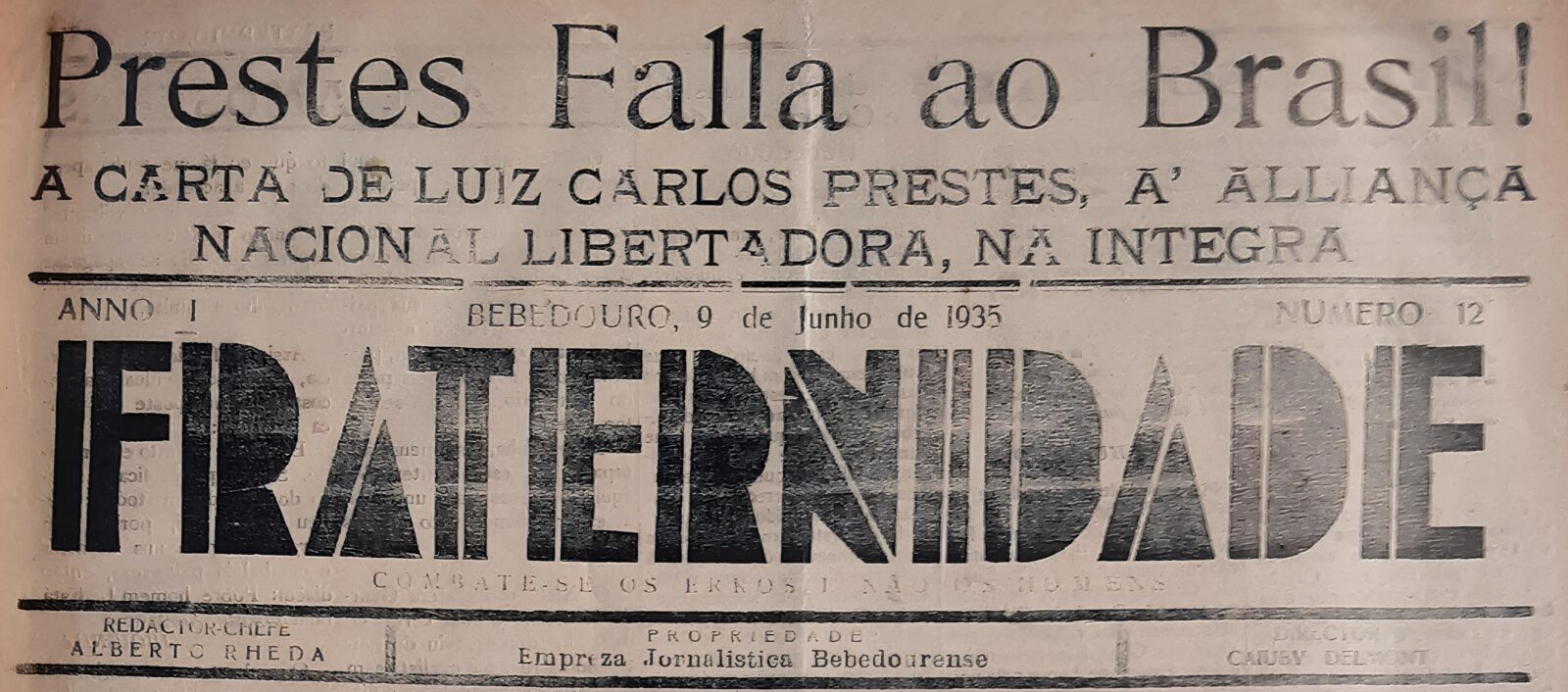 Em fevereiro do ano seguinte foi lançado o primeiro número do jornal “Fraternidade”, dirigido por Alberto Rheda e Caluby Delmont, que se divulgava como “um jornal do povo para o povo, precisa ser lido por todas as classes trabalhadoras”. O periódico teve circulação efêmera, rescrita a alguns meses de 1935, mas pode ser identificado como um veículo de divulgação da doutrina socialista, sendo comum a publicação de artigos de autoria e informações relacionadas à ANL, incluindo discursos e ações de Luís Carlos Prestes, principal liderança deste partido.