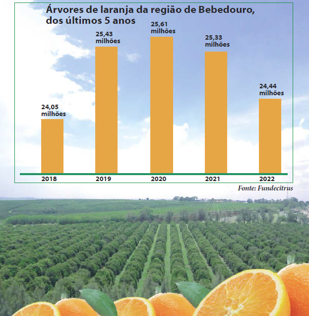 A Pesquisa de Estimativa de Safra (PES) 2022, realizada pelo Fundecitrus (Fundo de Defesa de Citricultura), aponta que o parque citrícola de São Paulo e Triângulo/Sudoeste Mineiro somaram 199,3 milhões de árvores de laranja, alta de 2,62%, em relação ao inventário de 2021, quando foram registradas 194,21 milhões de árvores.