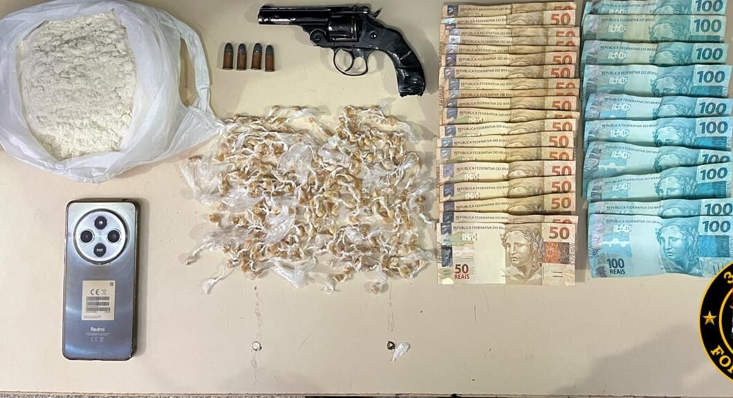 Homem foi preso em flagrante por tráfico de drogas e posse irregular de arma de fogo de uso restrito na segunda-feira (19), após abordagem da Força Tática na rua Aldo D’Arbo, em Bebedouro.