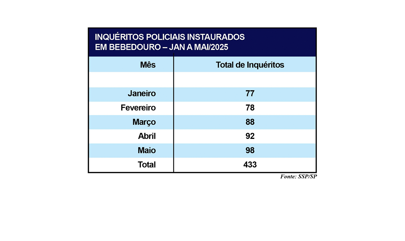 Entre janeiro e maio de 2025, a produtividade policial em Bebedouro somou 239 prisões efetuadas, e mais 164 registros de infratores presos em flagrante e 89 de infratores presos por mandado judicial, de acordo com dados divulgados pela Secretaria de Segurança Pública do Estado de São Paulo (SSP/SP).