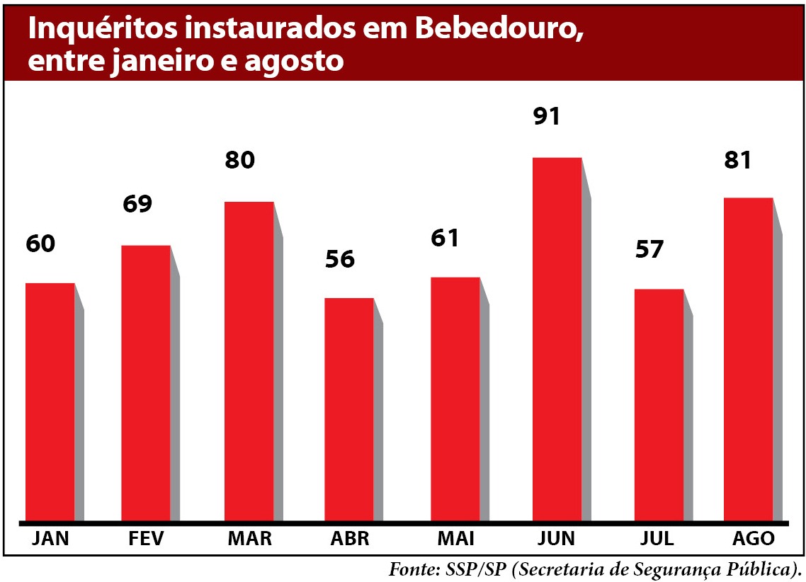 O número de inquéritos instaurados em Bebedouro durante os 31 dias de agosto foi o segundo maior desde o início deste ano, totalizando 81 registros. O crescimento é 42,10% maior que os 57 inquéritos instaurados em julho. Em janeiro, este tipo de indicador somou 60, passando para 69, em fevereiro e para 80, em março. Em abril foram 56 instaurações, passando para 61, em maio e 91, em junho, mês com maior índice. No acumulado do ano, Bebedouro já soma 555 inquéritos instaurados. Os dados são da produtividade policial, divulgados pela SSP/SP (Secretaria de Segurança Pública do Estado de São Paulo).