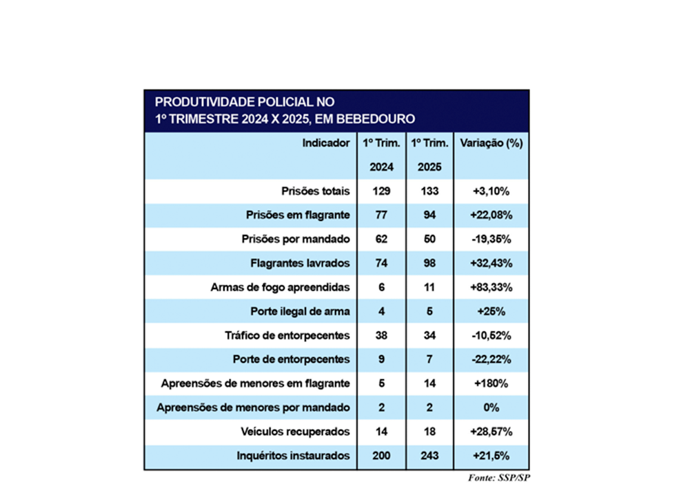 A Gazeta analisou os dados da SSP/SP (Secretaria de Segurança Pública do Estado de São Paulo), referentes à produtividade policial em Bebedouro, no primeiro trimestre de 2025 e comparou os dados com o mesmo período de 2024. Em janeiro foram registradas 14 ocorrências de tráfico de entorpecentes, quatro de porte e nenhuma de apreensão de drogas. Já em fevereiro, houve uma redução para 10 casos de tráfico, dois de porte e, novamente, nenhuma apreensão. Em março, o tráfico manteve-se em 10 ocorrências, com mais um registro de porte e um de apreensão de entorpecentes, este último indicador não foi registrado em 2024.