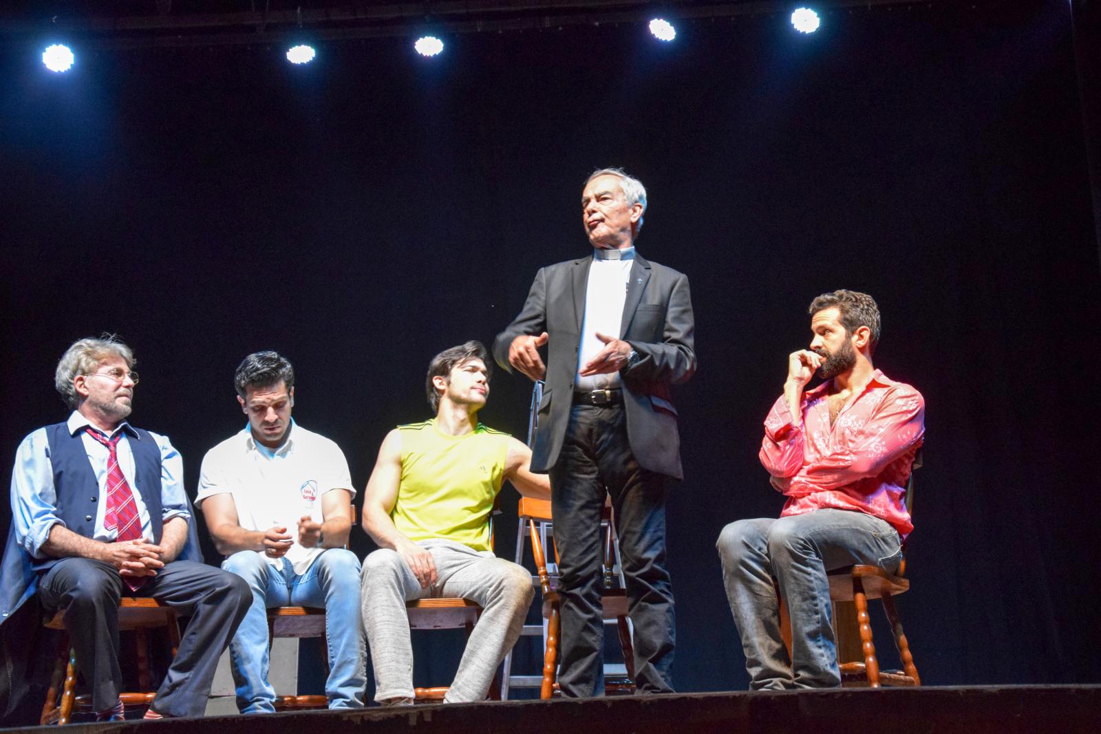 A comédia em palco bebedourense, na noite de domingo (24), sob a direção de Alexandre Reinecke, com os atores Edwin Luisi, Roberto Pirillo, Iran Malfitano, Custódio Júnior e Cláudio Andrade, interpretando homens com profissões, idades e sexualidades diferentes, teve elenco de peso, cujo cenário foi o porão de uma igreja, onde os amigos reúniam-se semanalmente para sessões de autoajuda.