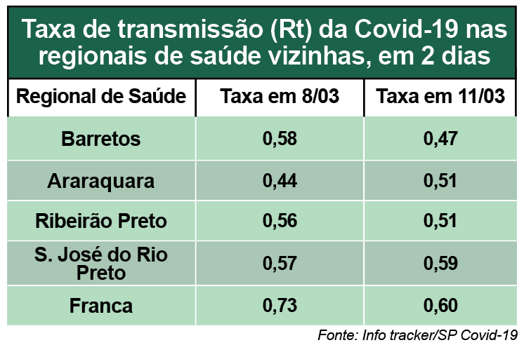 Em quatro dias, a taxa de transmissão (Rt) da Covid-19 na regional de Barretos, a que Bebedouro pertence, caiu 18,96% passando de 0,58 na sexta (11), para 0,47 na terça (15), ocupando primeiro lugar, com menor média, entre as regionais analisadas pela Gazeta. Também houve redução nas taxas da regional de Franca, de 0,73 para 0,60 (-17,80%) e Ribeirão Preto, de 0,56 para 0,51 (-8,92%). Araraquara que vinha mantendo menor índice, teve aumento, subindo de 0,44 para 0,51 (+15,90%). São José do Rio Preto também cresceu de 0,57 para 0,59 (+3,5%).