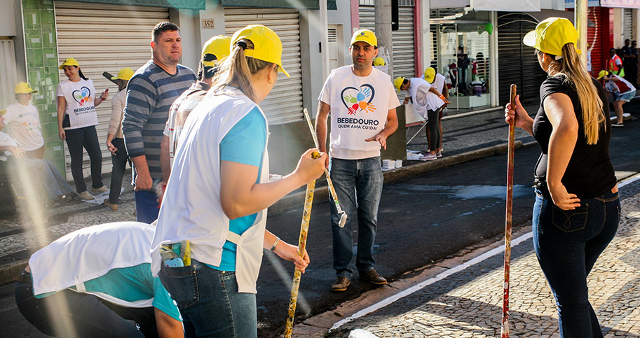 Depois que receberam instruções, os voluntários foram divididos em equipes e pintaram guias, sarjetas, floreiras e lixeiras.