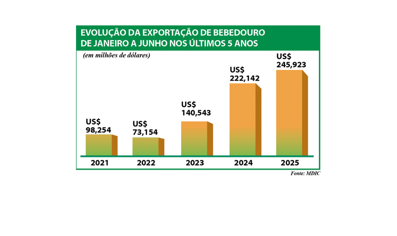 A receita com exportação de Bebedouro cresceu 10,7% no primeiro semestre deste ano, no comparativo com 2024 (US$ 245,923 milhões x US$ 222,142 milhões), registrando o melhor resultado dos últimos cinco anos, segundo dados do MDIC (Ministério da Indústria, Comércio Exterior e Serviços).