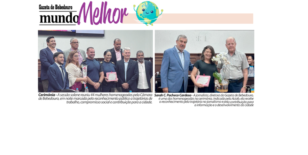 Reconhecer mulheres por suas trajetórias não é apenas celebrar conquistas individuais, mas reforçar o compromisso coletivo com uma sociedade mais consciente e mais humana. E é justamente a partir de atitudes como essa, que valorizam exemplos, inspiram novas gerações e ampliam o respeito, que se constrói, pouco a pouco, um Mundo Melhor.