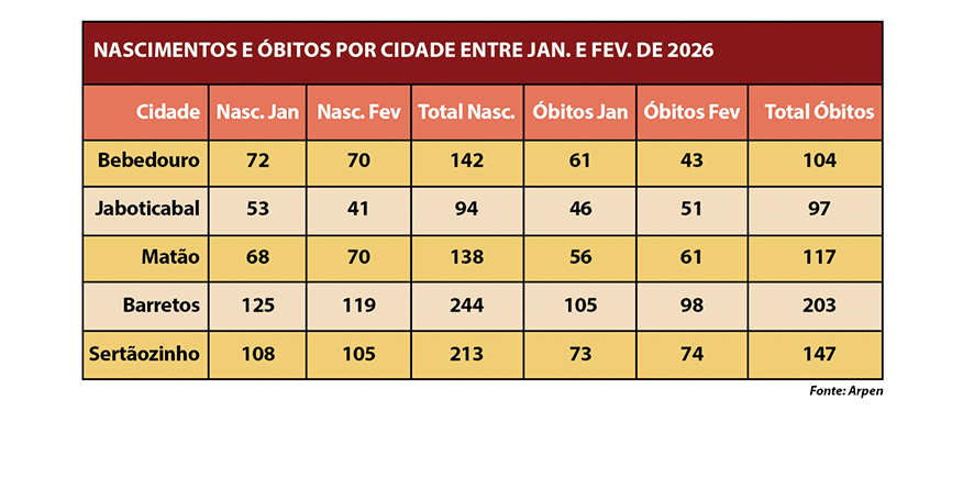 Levantamento realizado pela Gazeta de Bebedouro, com base em dados do Portal da Transparência do Registro Civil da Arpen, mostra que as cinco cidades analisadas: Bebedouro, Jaboticabal, Matão, Barretos e Sertãozinho, registraram juntas 831 nascimentos e 668 óbitos no primeiro bimestre de 2026.