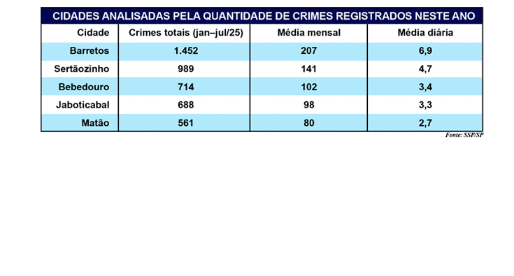 Barretos é o município mais violento da região analisada, com média de 207 crimes/mês, equivalendo a perto de sete por dia. Na sequência aparece Sertãozinho, com 141 crimes mensais (4,7 por dia). Bebedouro ocupa a terceira posição neste ranking, com 102 registros/mês, ou 3,4 por dia, à frente de Jaboticabal, que soma 98 casos mensais (3,3 por dia), e de Matão, cidade com menor índice entre as analisadas, com 80 ocorrências mensais (2,7 por dia).