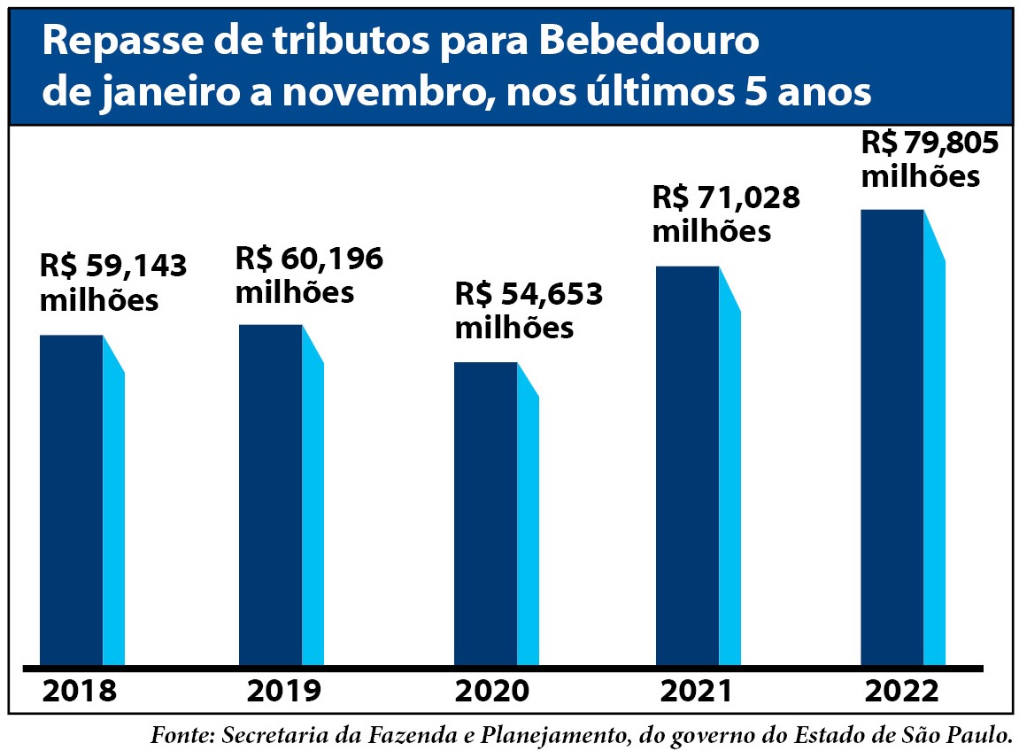 O governo do Estado de São Paulo repassou à Prefeitura de Bebedouro, de janeiro a novembro deste ano, R$ 79,805 milhões em tributos, alta de 12,35%, em relação ao mesmo período de 2021 (R$ 71,028 milhões), segundo dados da Secretaria da Fazenda e Planejamento, do governo do Estado de São Paulo.