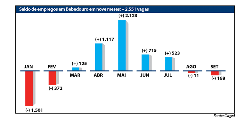 Em setembro, Bebedouro fechou novamente com saldo negativo na geração de empregos com carteira assinada: (-) 168, com variação relativa de (-) 0,53%, resultado de 1.204 admissões e 1.372 demissões. Em agosto, a cidade havia fechado com (-) 11 vagas, após o registro de 1.361 admissões e 1.372 demissões. Os dados são do Caged (Cadastro Geral de Empregados e Desempregados), do Ministério da Economia.