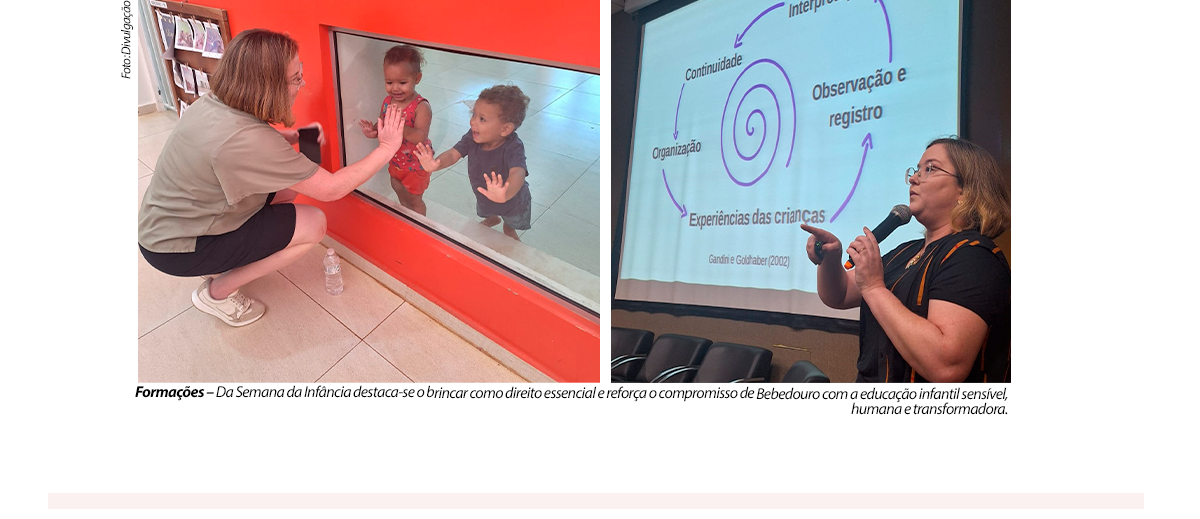 A Semeb (Secretaria Municipal de Educação) promoveu de 6 a 8 de outubro, formações voltadas à Educação Infantil com o tema “O Brincar”, ministradas pela professora Gil Menslin, pedagoga, especialista em Educação Infantil e mestre em Educação. As atividades integraram a Semana da Infância e foram destinadas às professoras da Educação Infantil I e II, realizadas de forma presencial no Unifafibe.