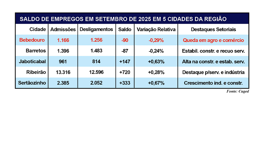 Os dados mais recentes do Caged (Cadastro Geral de Empregados e Desempregados), analisados pela Gazeta de Bebedouro, mostram que Bebedouro encerrou setembro de 2025 com desempenho negativo no mercado formal de trabalho, em contraste com a maioria das cidades da região. Enquanto o município registrou saldo de (-) 90 vagas, cidades como Jaboticabal (+147), Sertãozinho (+333) e Ribeirão Preto (+720) fecharam o mês em alta. Apenas Barretos, assim como Bebedouro, apresentou retração, com saldo de (-) 87 empregos. Veja, abaixo, a análise da Gazeta por cidade.