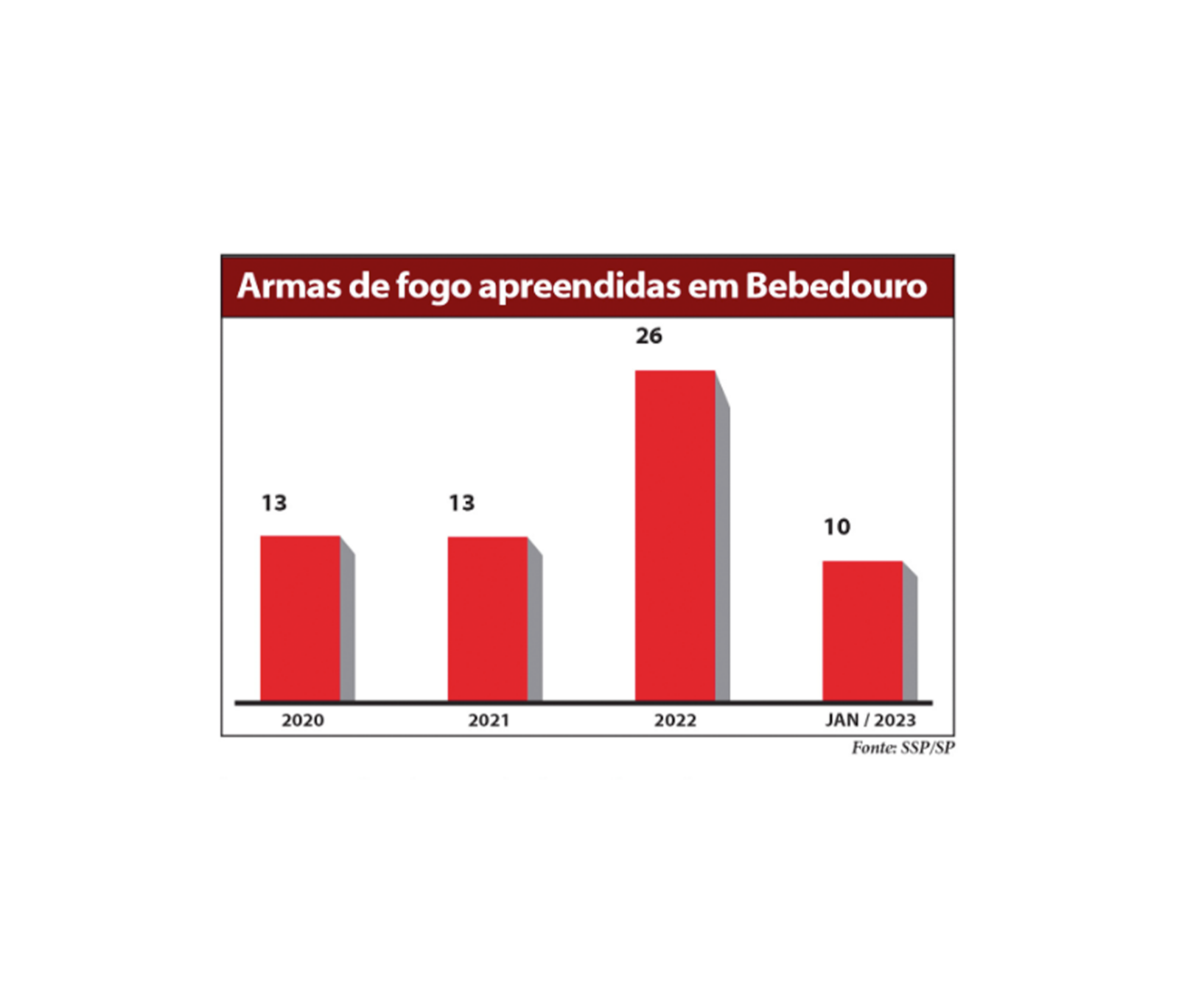 Somente em janeiro deste ano, a polícia de Bebedouro registrou a apreensão de 10 armas de fogo. Este número é 400% maior que os dois registros deste tipo contabilizados em janeiro de 2022. Para se ter ideia, no mês anterior, dezembro de 2022, não houve registro deste tipo. Os dados são da Produtividade Policial, divulgados pela SSP/SP (Secretaria de Segurança Pública do Estado de São Paulo).