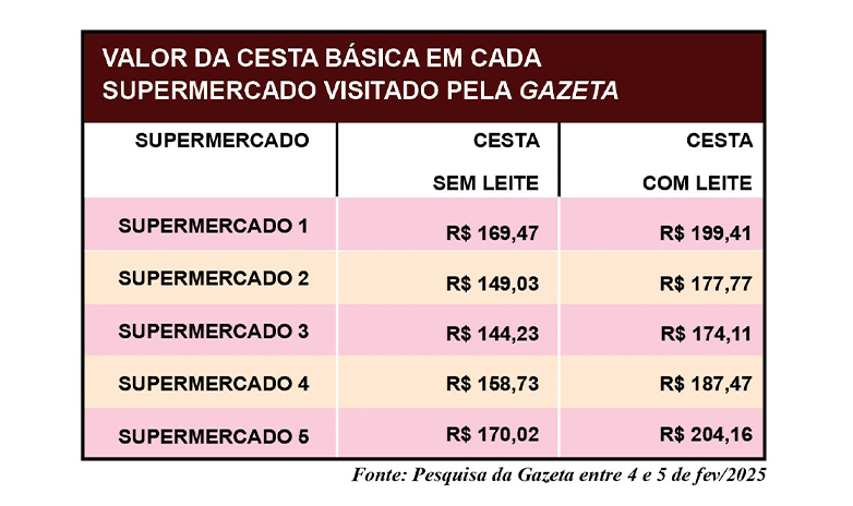A Gazeta de Bebedouro realizou levantamento exclusivo sobre o preço médio da cesta básica paga pelos consumidores da cidade. A reportagem visitou os cinco maiores supermercados locais para analisar os valores praticados nos itens essenciais ao dia a dia das famílias bebedourenses. A partir dos dados coletados, a média geral da cesta básica em Bebedouro foi calculada em R$ 158,70 sem inserir o leite e R$ 188,98 com a inclusão de seis litros de leite.
