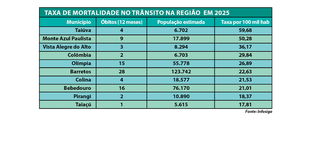 Os dados do Infosiga, sistema do Governo do Estado de São Paulo que consolida as estatísticas de trânsito, mostram que Bebedouro apresentou, em 2025, taxa de mortalidade no trânsito inferior à registrada em diversos municípios menores da região. Considerando os óbitos ocorridos nos últimos 12 meses, Bebedouro contabilizou 16 mortes, o que, diante de população de 76.170 habitantes (censo de 2022), resulta em taxa de 21,01 óbitos por 100 mil habitantes.