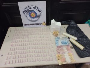 Em uma moita próxima, a PM localizou mais 20 eppendorfs de cocaína, além de 34 invólucros de crack. O condutor, ao ser questionado, disse que estava no local para comprar drogas. Os dois foram encaminhados ao Hospital Municipal e, posteriormente, ao plantão policial, onde foi elaborado boletim de ocorrência por flagrante de tráfico de drogas.