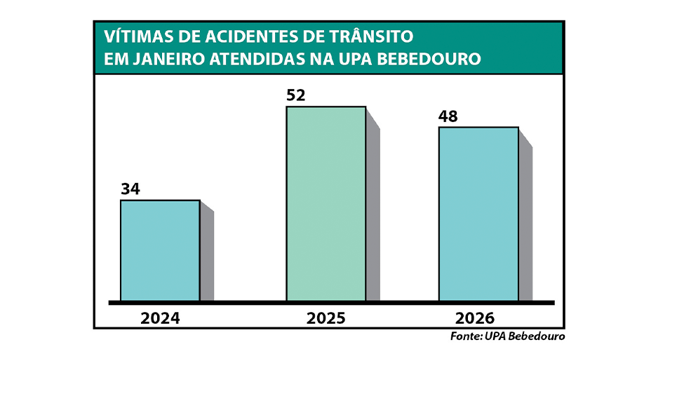 A Unidade de Pronto Atendimento de Bebedouro registrou 48 vítimas de acidentes de trânsito ao longo dos 31 dias de janeiro de 2026, distribuídas em 38 ocorrências atendidas no período. Os dados apontam predominância de acidentes envolvendo motocicletas, especialmente quedas, que concentraram a maior parte dos atendimentos realizados pela unidade.