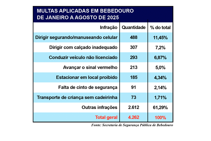 Entre janeiro e agosto de 2025, o Departamento Municipal de Trânsito de Bebedouro aplicou 4.262 multas por diferentes tipos de infrações, segundo relatório oficial da Prefeitura. O levantamento mostra que dirigir segurando ou manuseando o celular foi a principal causa de autuações, somando 488 registros, o equivalente a 11,45% do total.