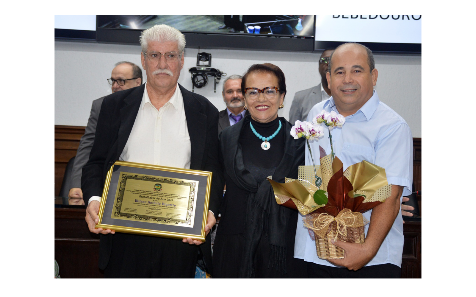 “Quero agradecer a todos que me concederam este título. Me sinto muito feliz e honrado por receber esta honraria. Não nasci em Bebedouro, mas me sinto um bebedourense nato, pois vivo há 58 na cidade. Dedico esta honraria a todos vocês”, diz Wilson Riguetto, supervisor de Esportes, ao receber título de “Trabalhador do Ano”, na noite de quinta-feira (27). Mais 19 pessoas indicadas receberam título de honra ao mérito.